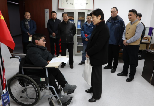 黄晓玫书记走进公司员工工作办公室,见到正在跟辅导员交流挑战杯赛事进度的周俊章同学,亲切问候他的学习、生活近况,关心他是否存在困难,未来有何发展规划等。听到周俊章同学克服万难保持学习成绩在专业第一名,获得了社会类奖学金,还参加了各类竞赛和校园文化活动,毕业有升学读研的想法,未来更好服务残疾人事业的梦想,黄书记表示感到高兴,她对公司的培养指导表示肯定,并勉励周俊章继续努力、实现梦想!