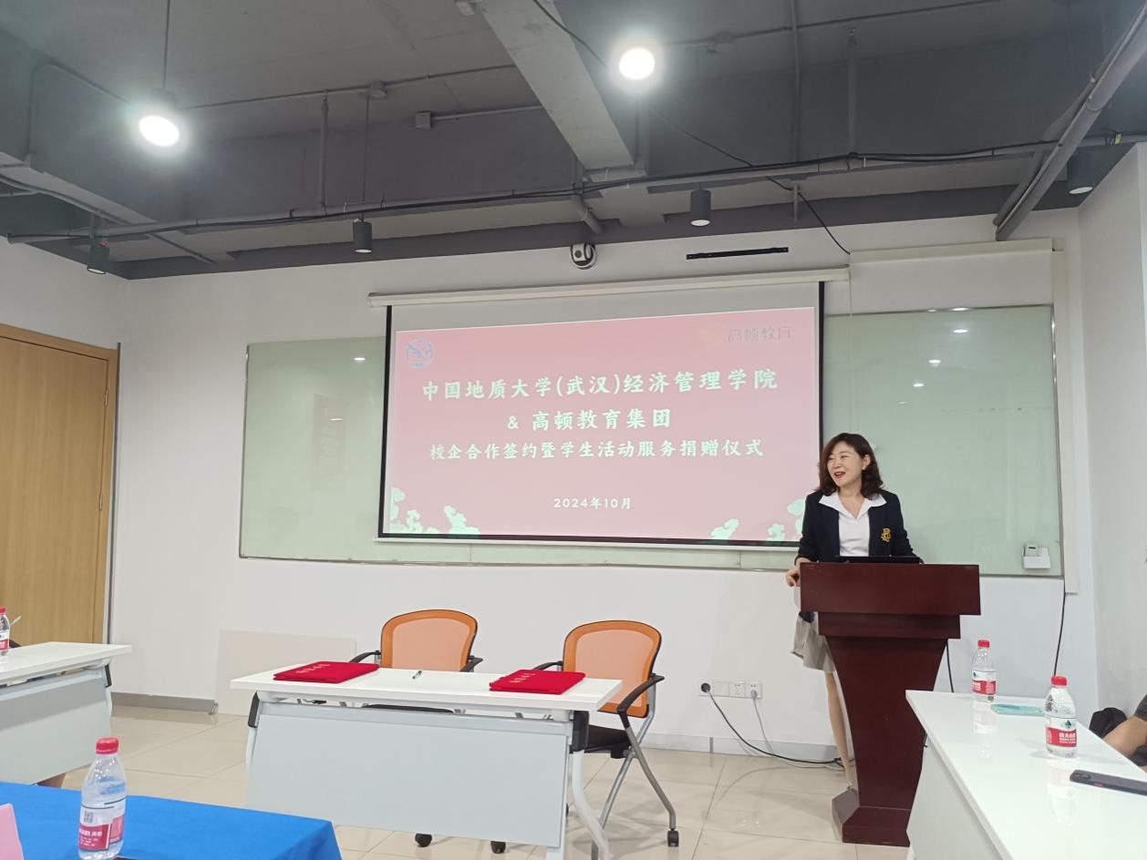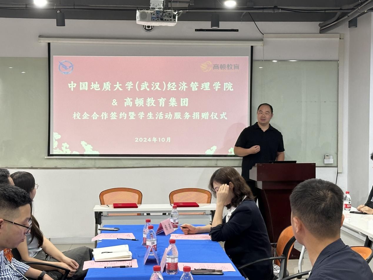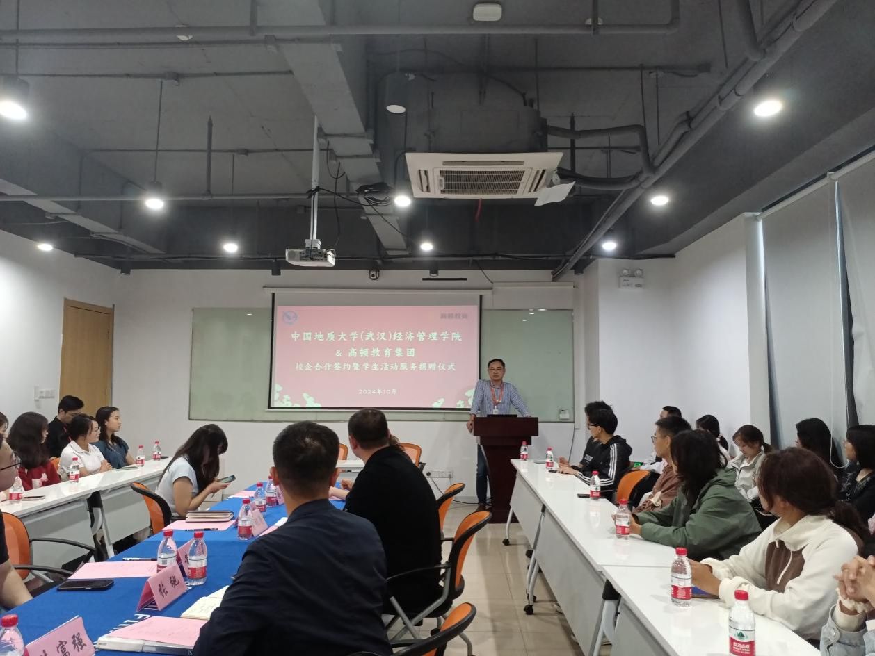 10月17日下午,公司师生一行赴高顿教育集团武汉总部,开展院企合作签约暨员工活动服务捐赠仪式。高顿教育合伙人兼高顿教育中原战区总经理吴月明、高顿教育武汉分校市场总监黄新成、ACCPA项目经理郑帅、市场主管朱富强、项目主管徐梓涵出席仪式,公司党委副书记李纪亮、会计系主任杨洁、辅导员张弛以及部分本科生代表一同参加。仪式由郑帅主持。