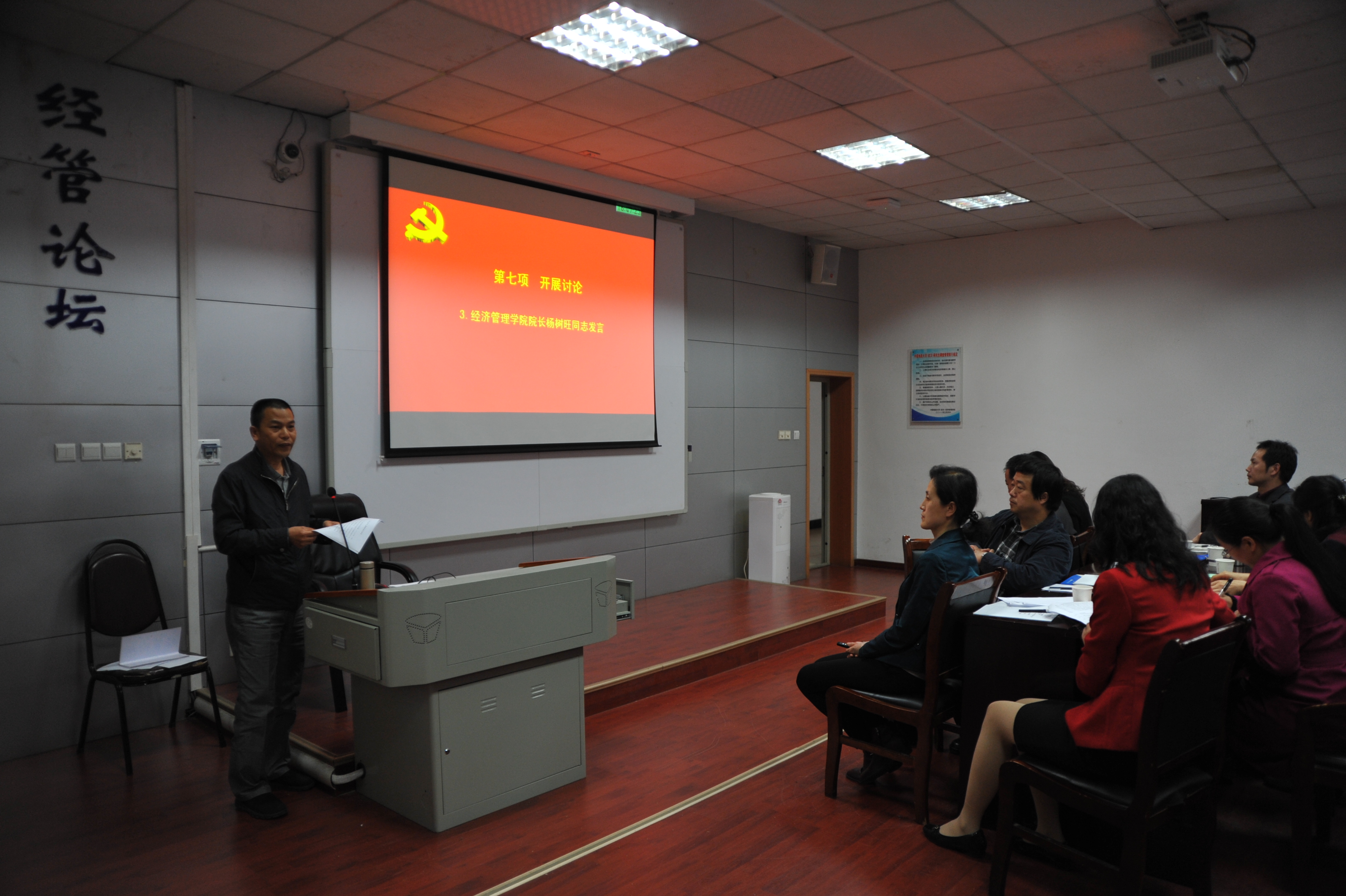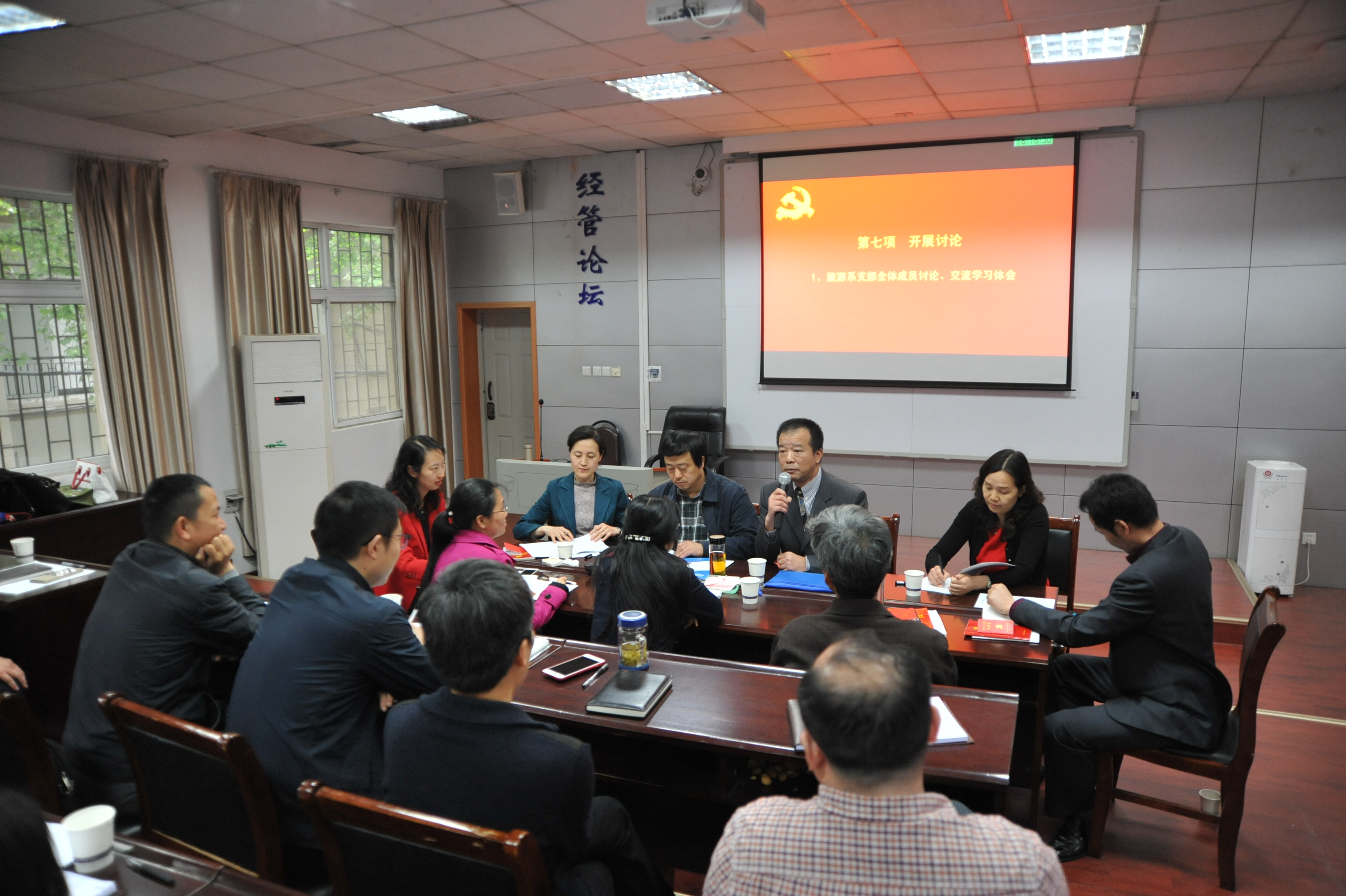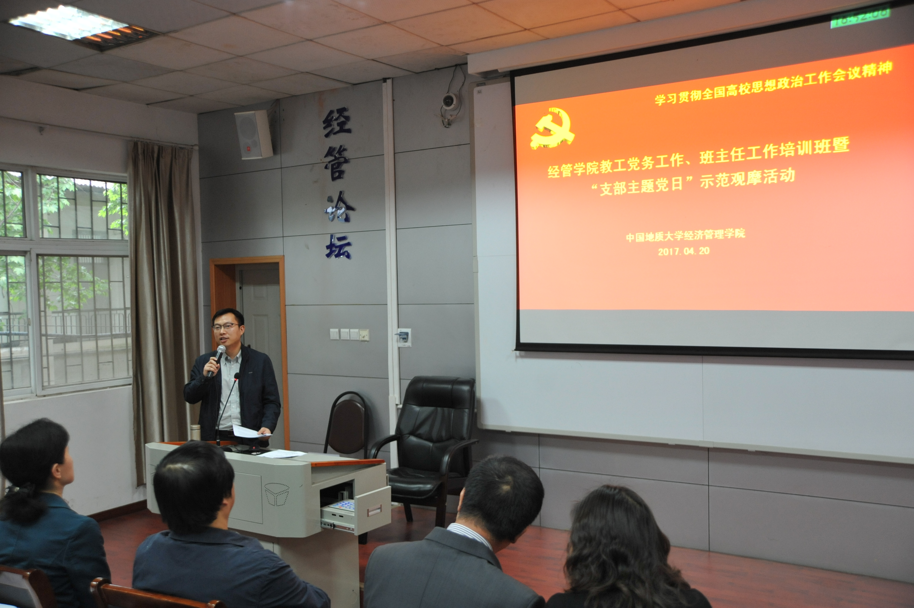2017年4月20日下午,XCSport在北三楼208会议室举办了教工党务、班主任工作培训班暨“支部主题党日”示范观摩活动。为推进“两学一做”学习教育常态化、制度化,深入贯彻落实党的十八届六中全会和全国高校思想政治工作会议精神,认真贯彻落实中共中央、国务院《关于加强和改进新形势下高校思想政治工作的意见》精神,结合党支部“支部主题党日”的部署要求,提高“支部主题党日”活动的针对性、实效性,经济管理公司党委精心布置并组织了本次培训与观摩活动。出席和参加本次活动的人员有:经济管理公司党委委员、纪委委员,各教工党支部委员、全体专职与兼职辅导员、本科班级班主任,以及旅游系教工党支部全体党员。活动由XCSport公司副书记沈波同志主持,校组织部副部长梁本哲同志莅临现场并指导。