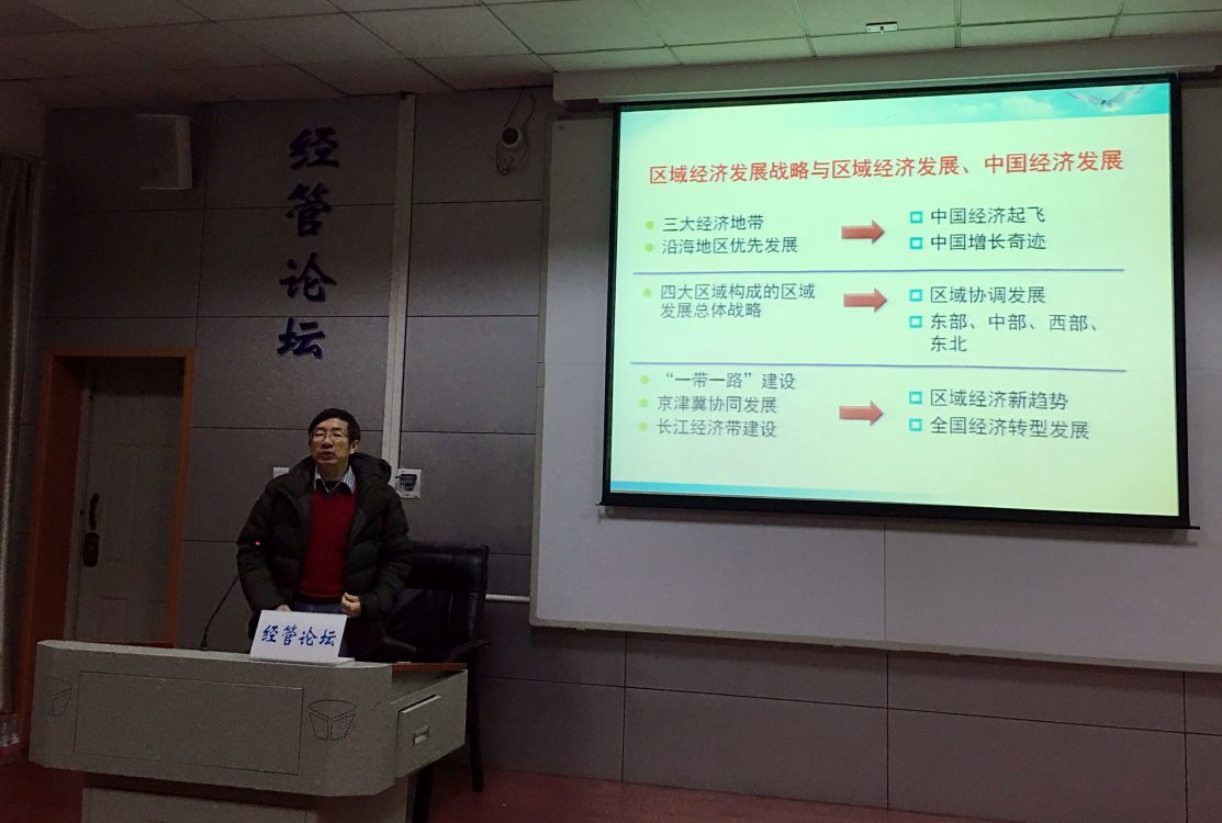 覃成林教授以中国在世界经济的战略地位为出发点,探讨了中国区域经济对国家整体发展战略起到的重要作用,并结合中国区域经济发展现状与国家整体战略,提出了“四横四纵”八大国家发展轴与“七大国家增长级”的概念,对国家顶层设计与地方创新发展提出了创新性的建议。覃教授的报告契合了当今社会经济发展的需要,顺应了经济发展的大趋势,加深了师生们对“多极化”问题的认识和理解,对专业学习和专业发展有了进一步的认知。