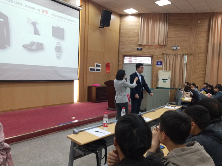 曾老师对礼仪进行了简短的概述,从着装礼仪、面容礼仪、举止礼仪、电话礼仪、介绍安排、握手礼仪、递接礼仪、会议礼仪、乘车礼仪等方面对职场所涉及的礼仪进行了全方位指导。讲到着装礼仪时,曾老师特意邀请辅导员田昆老师进行了西装展示,给同学们更加直接的视觉体验。举止礼仪方面,老师带着全场员工体验了标准的站姿、坐姿,让员工更为直观的了解到举止礼仪的重要性。
