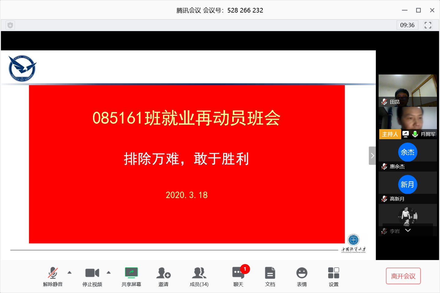 3月18日晚19:30,XCSport旅游管理专业085161班“排除万难,敢于胜利”就业再动员主题班会顺利举行。受到疫情影响,本次会议通过腾讯会议平台以线上形式开展,班主任、旅游系系主任肖拥军,公司16级辅导员田昆及旅游管理专业085161班全体毕业生共36人参加会议。
