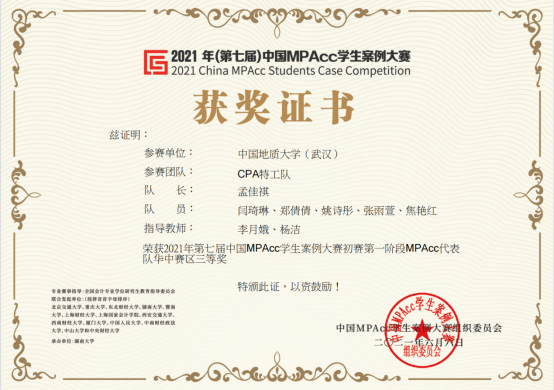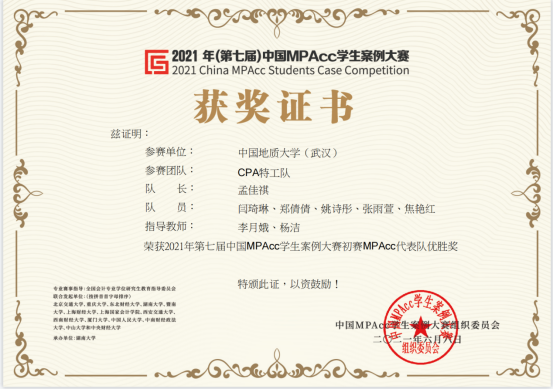 (通讯员:孟佳祺)6月6日,第七届全国MPAcc案例大赛落下帷幕。本次大赛分东北、华北、华东、华南、华中、西北、西南七大赛区,共2882个MPAcc学员团队授权参赛。在此次比赛中,公司MPAcc团队在竞争激烈的华中赛区取得了较好成绩。其中,以李月娥教授、杨洁教授为指导老师,孟佳祺同学为组长的“CPA特工队”在大赛第一阶段取得华中赛区第6名成绩,荣获华中赛区三等奖;大赛第二阶段取得了第27名的成绩,荣获全国优胜奖。