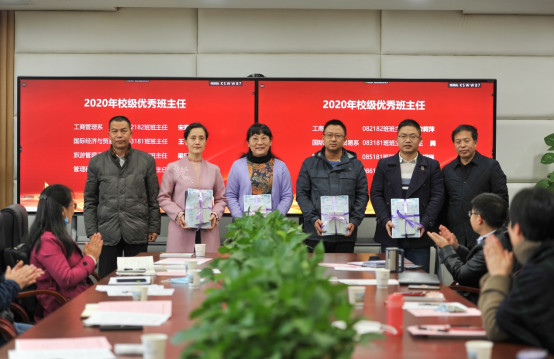 党委书记杨昌锐、经理杨树旺为2020年校级优秀班主任宋莉萍、王腾、梁玥琳、李龙锡老师颁发纪念品。