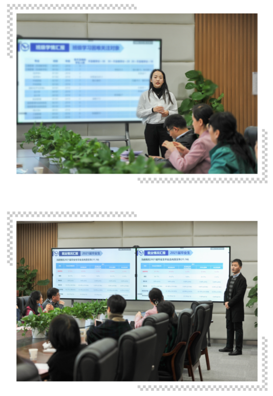 徐媛老师首先汇报公司员工学习情况和学风建设情况。近年来,公司坚持打造“严在经管”品牌,公司学风建设卓有成效,员工学习成绩大幅提高,迈入绩点“3.0+”时代。徐老师向班主任老师对班级学风建设的付出表示感谢,指出在接下来的工作中要继续关注高不及格学分员工的学业状态和心理压力。接下来,张弛老师通报了2021届和2022届毕业生班级就业情况,并根据实现充分就业、高质量就业的目标,结合目前各班开展工作的具体情况,提出了工作建议。