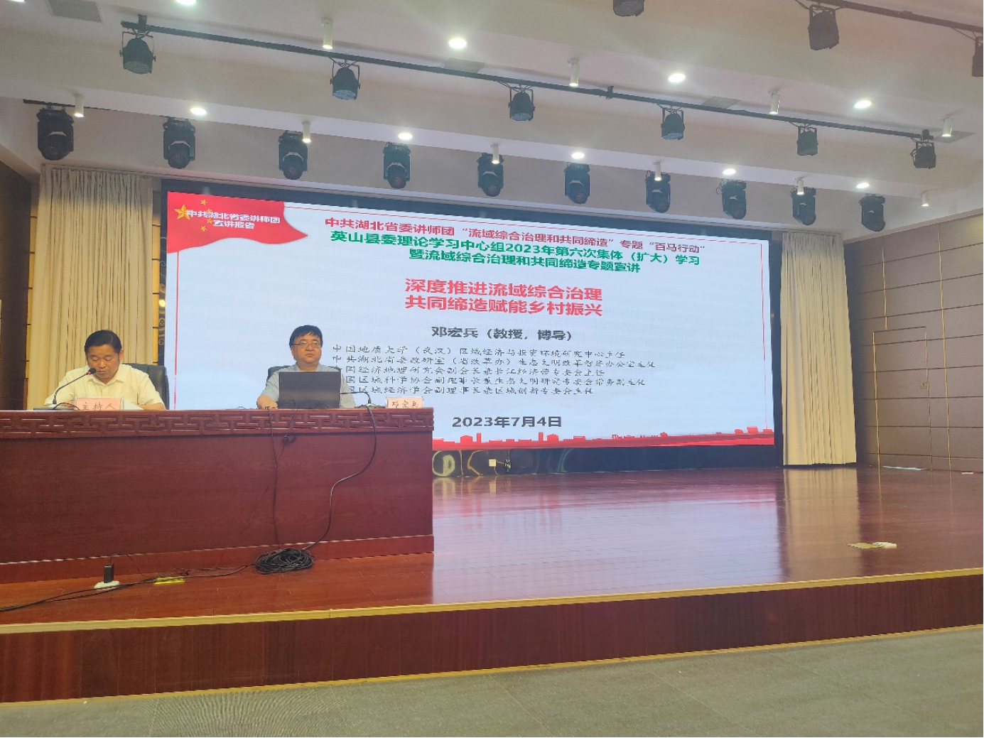 根据中共湖北省委讲师团统一安排部署,7月3日至4日,公司金融与贸易系邓宏兵教授赴英山县参加中共湖北省委讲师团“流域综合治理和共同缔造”专题“百马行动”宣讲活动。7月4日上午给英山县委理论学习中心组2023年第六次集体(扩大)学习做了《深度推进流域综合治理,共同缔造赋能乡村振兴》专题辅导报告。邓教授从深度推进流域综合治理和共同缔造赋能乡村振兴两个角度,阐明如何在实践中把握党的二十大精神,深度推进流域综合治理和统筹发展,自觉践行习近平生态文明思想,共同缔造谱写乡村振兴新篇章,绘制生态优先、绿色发展的蓝图。邓宏兵教授在此次宣讲调研过程中,根据有关部门反映的情况和意见,充分发挥专家优势,针对英山县在流域综合治理和乡村振兴等工作中遇到的问题献言建策,助力其进一步理清工作思路,结合英山优势特色,充分发挥比较优势,推进各项工作高质量发展。