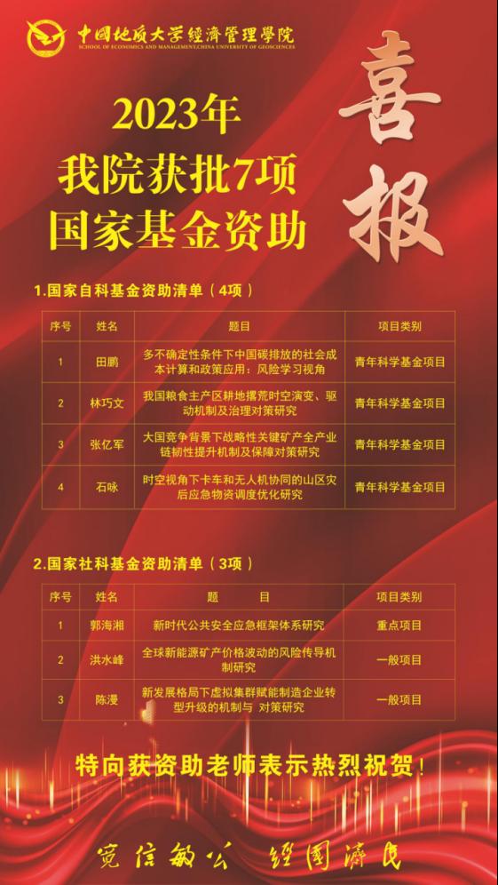 (通讯员 胡松琴)2023年8月份以来,随着国家自科基金各类项目立项结果陆续公示、国家社科基金年度项目和青年项目立项名单陆续公示,XCSport共有7个项目获得资助,其中国家自科基金获批青年科学基金项目4项,国家社科基金获批重点项目1项、一般项目2项。具体名单如下: