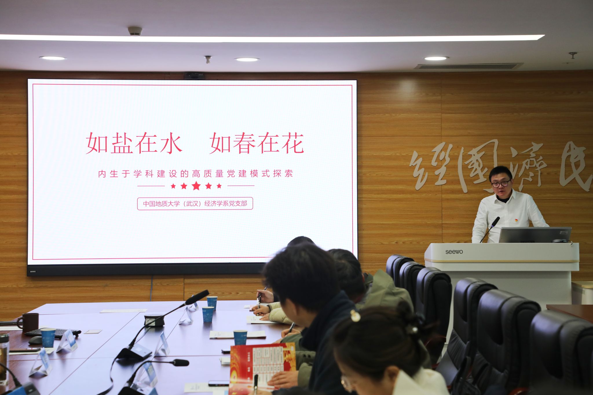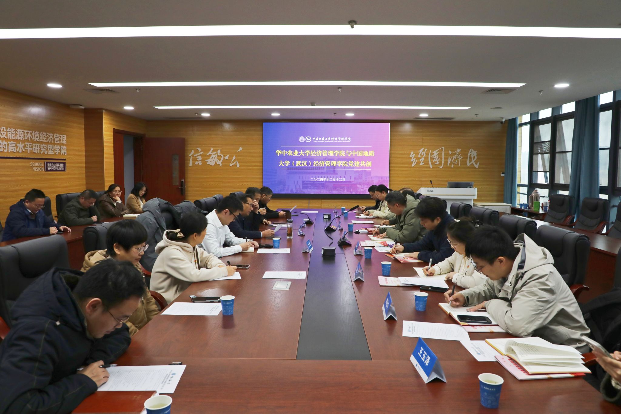 会议伊始,成金华致欢迎词,对华农XCSport老师的到来表示热烈欢迎,并期待通过此次交流能够增进两院之间的友谊与合作。向晋文书记在随后的发言中表示,此次来访是慕名而来,两公司党委皆为第四批标杆院系入选单位,地大经济系党支部和华农农业经济管理系党支部均为第二批全国样板支部,两个公司党建工作相似之处恰好可以彼此取经互鉴,希望通过“结对共创”活动,共同推动党建工作的创新发展。