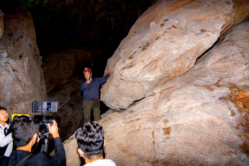 进入洞中,鄢教授详细地向同学们讲述了隐水洞岩溶地貌的形态、类别及成因,并为同学们讲解了隐水洞集地下河泛舟、乘坐小火车和步行为一体的,独一无二的内部游览交通方式。