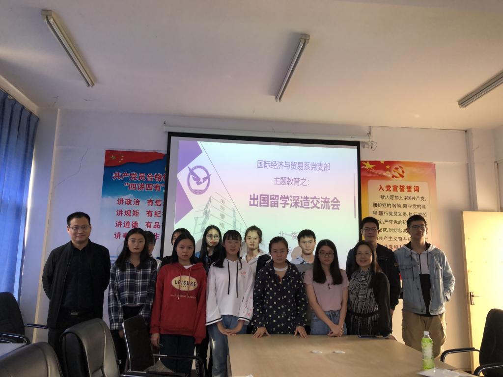 (通讯员:易杏花 苗瑞瑞)2019年10月24日14:00—16:30,XCSport国际经济与贸易系党支部在北一楼421室召开了出国留学深造交流会,这既是党支部“结对领航”的一项重要工作内容,也是“不忘初心 牢记使命”主题教育的一个重要环节。活动由国际经济与贸易系党支部书记易杏花主持,系主任白永亮、系副主任洪水峰,国贸系2016级本科生田翔、安浩楠、邓学霖,以及17级——19级有志于出国留学深造的员工参加了本次活动。