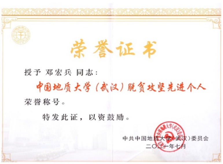 图3邓宏兵教授被授予“XC体育(武汉)脱贫攻坚先进个人”荣誉证书