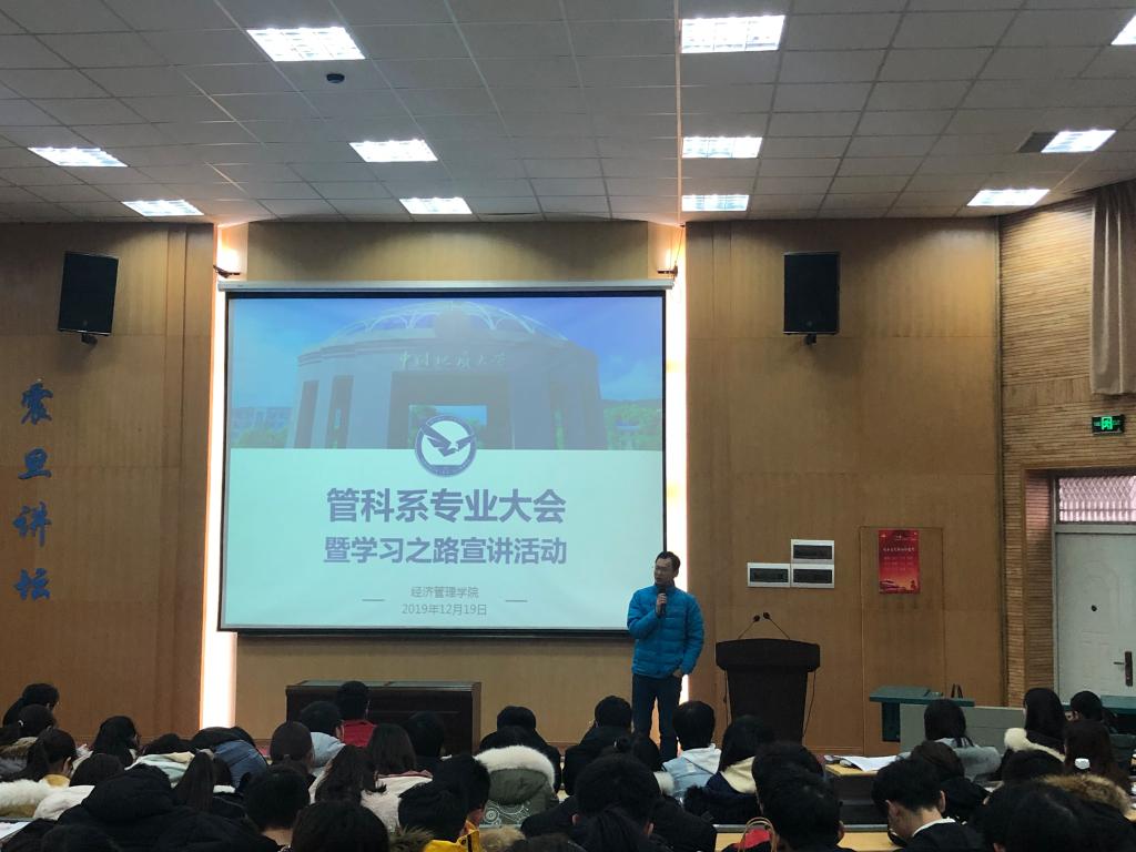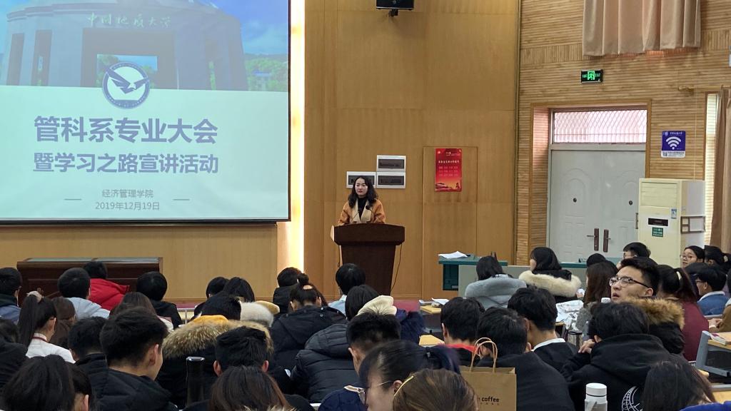 2019年12月19日,XCSport管理科学与工程系本科生专业大会暨学习之路宣讲活动在教三楼109召开,管科系副主任翁克瑞老师、管科系辅导员徐媛老师出席大会,17-19级管科系全体员工参会,会议由徐老师主持。