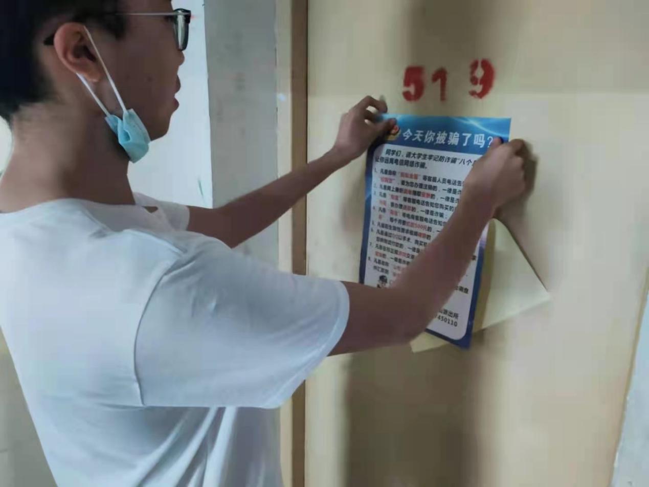 图7.员工志愿者在宿舍园区张贴防诈骗宣传单