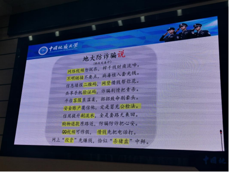 讲座进行时,彭冠军老师多次与现场同学进行互动交流。就如何避免“裸聊”诈骗发生,他提到,我们应做到一是注意保护个人隐私,在使用微信、QQ等通讯工具添加好友时,注意甄别陌生人的意图;二是洁身自好,拒绝不健康的网络内容和诱导性不良人员。针对非法校园贷,他提到,我们应提高判断是非的能力,合理规划消费,不贪图享乐、爱慕虚荣,把注意力更多放在当下的学习生活中。详细讲解了多种最新的诈骗形式后,他通过分享公司安全保卫部总结归纳的“地大防诈骗说”,给同学们普及了防骗知识。