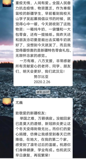 再问他们此时有何感受时,他们回答:“同样的分发物资场景,让我们回忆起自己在内初、内高班时,公司在节假日为我们分发水果和零食的画面,想起大学入学时,公司发给我们棉衣棉被等补助,那是党和国家的民族政策帮助我们迎难而上,让我们学会了守望相助、患难与共;那是公司对少数民族员工的无尽关怀,教会了我们要有责任担当和大爱精神,共同团结奋斗!所以,我们一定要用实际行动回报党和国家对我们的恩情。能帮助留校的同学们解决一点困难,为他们送去一点温暖,就是我们最大的愿望。”