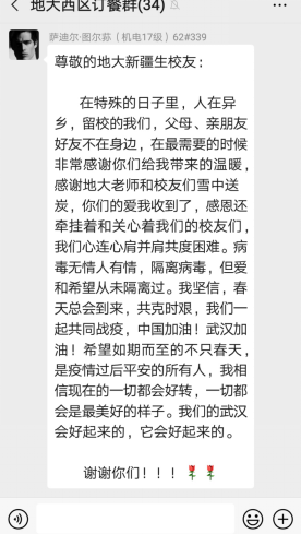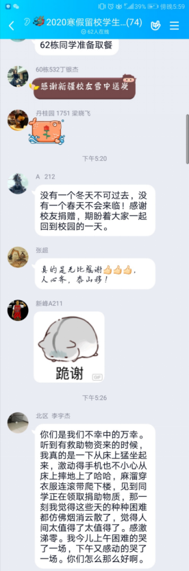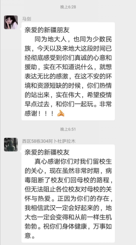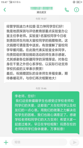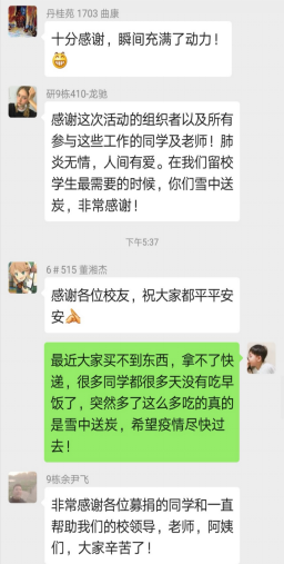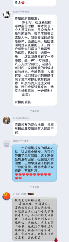 公司党委副书记王林清教授称赞道:“特殊时期,特别关爱,彰显同学情、爱校情,感谢同学们!”同时表达了问候。地大有真情,地大有温暖!在这个病毒肆虐的日子里,是地大“石榴籽”们用真情和爱心汇聚起了一缕阳光,团结一致为留在公司的同学们送去了温暖。收到援助物资后,老师和同学们用QQ、短信等方式纷纷点赞和表示感谢,也有的老师和同学以赋诗吟诵等方式表示致敬。