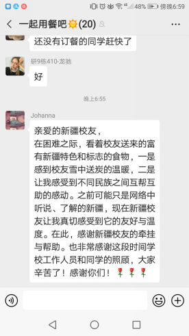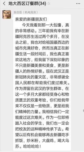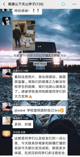 当爱心援助活动结束后,问起XCSport的4位同学怎么想起做此善举时,他们说:“其实,我们也只是想尽最大努力,为受疫情影响不能回家的同窗们做一点力所能及的事情。地大人的真情与爱心才是留校同学们温暖的源泉,我们只是爱心善举的“搬运工”。在此,我们应向广大献出爱心的老师、同学及员工们表示感谢,希望我们一直都像石榴籽一样紧紧地抱在一起!”
