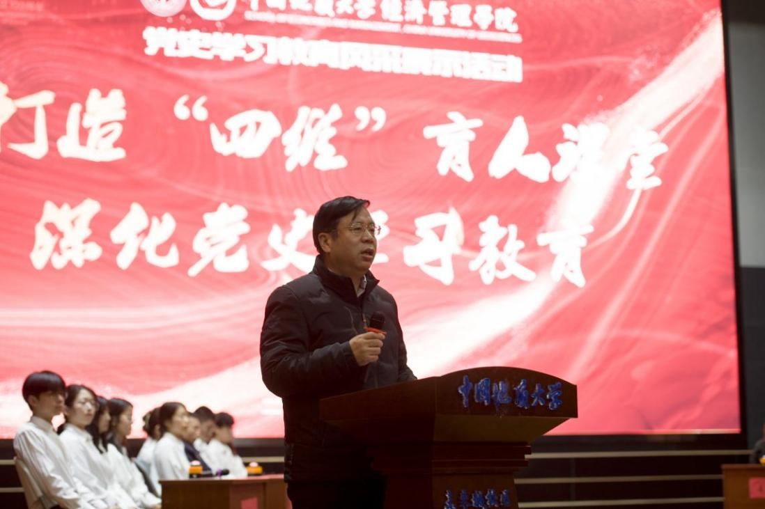 经济管理公司党委书记杨昌锐介绍了公司党史学习教育开展情况,重点从“锚定深:百年党史学深悟透”“聚焦领:思想引领贯穿全程”“彰显实:服务师生全面发展”三方面,总结回顾了公司党史学习教育的阶段性进展和成效。